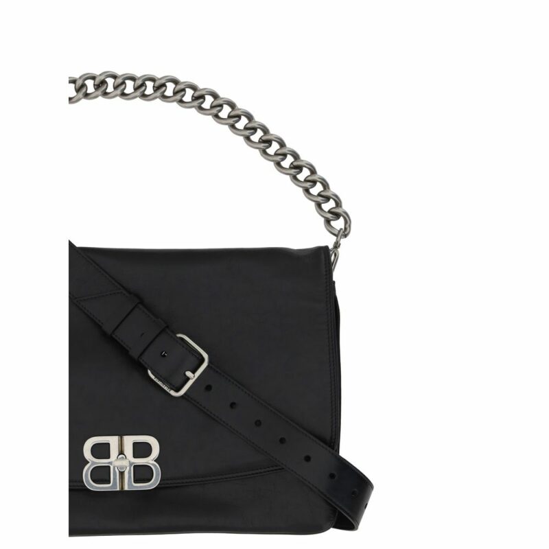 Calfskin Shoulder Bag by Balenciaga, chain top handle, adjustable and removable flat leather shoulder strap, front closure by flap and interlocking mechanism, brand’s iconic BB logo embossed and contrasting on front, padded design, triple interior compartment.