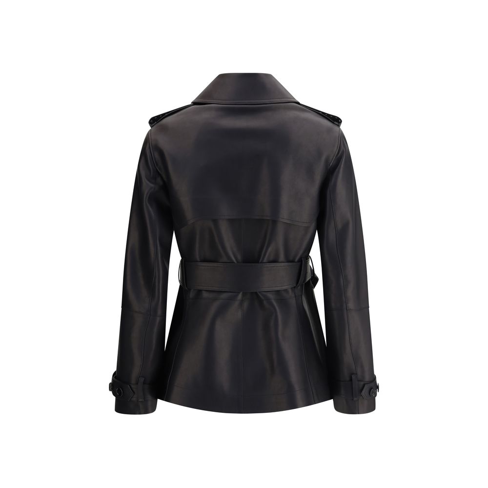 Leather Jacket by Burberry, front button and zipper closure, two side welt pockets with flaps, classic collar, flat stud detail applied at shoulders, belt loops for waistband, adjustable and removable matching belt, monochrome pattern, regualr fit.