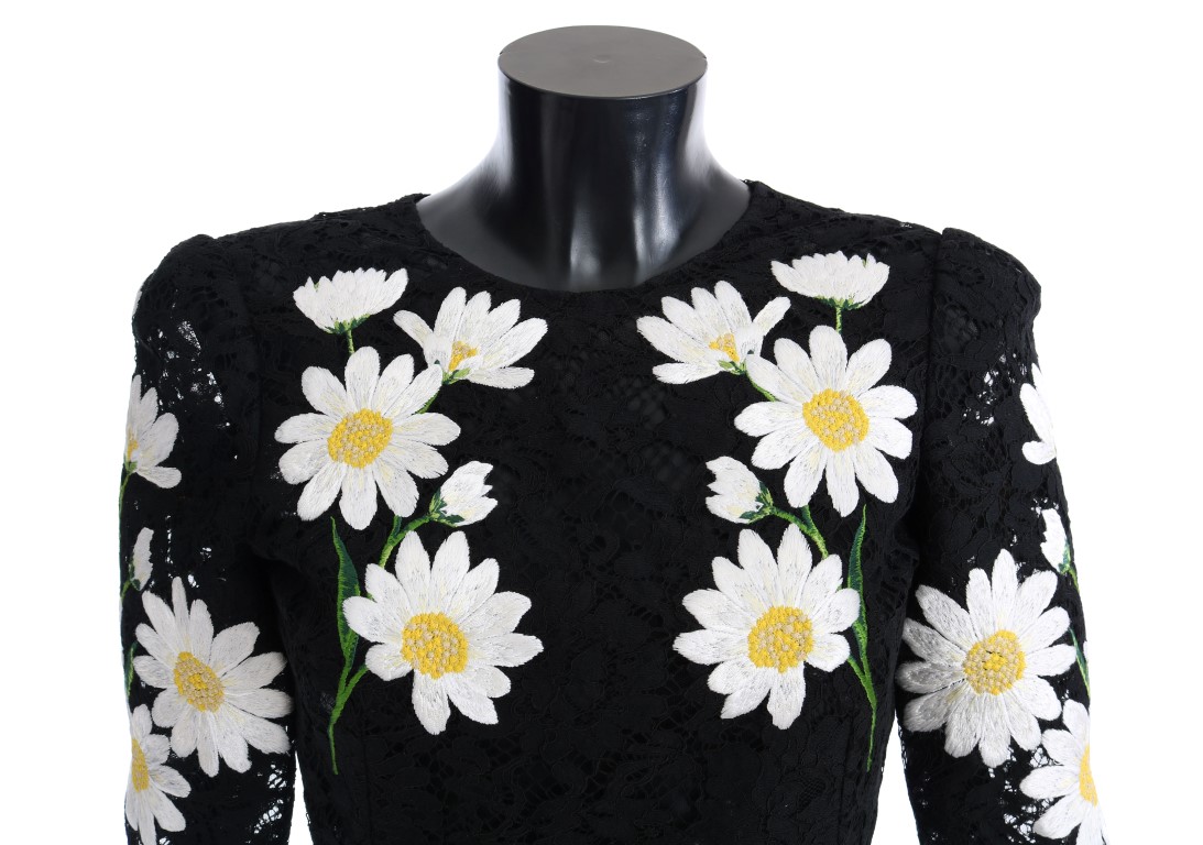 Elevate your wardrobe with this exquisite Dolce & Gabbana black floral lace dress, featuring charming Chamomile embroidery. Its sheath cut and refined details showcase high craftsmanship, perfect for those who seek luxury and sophistication.