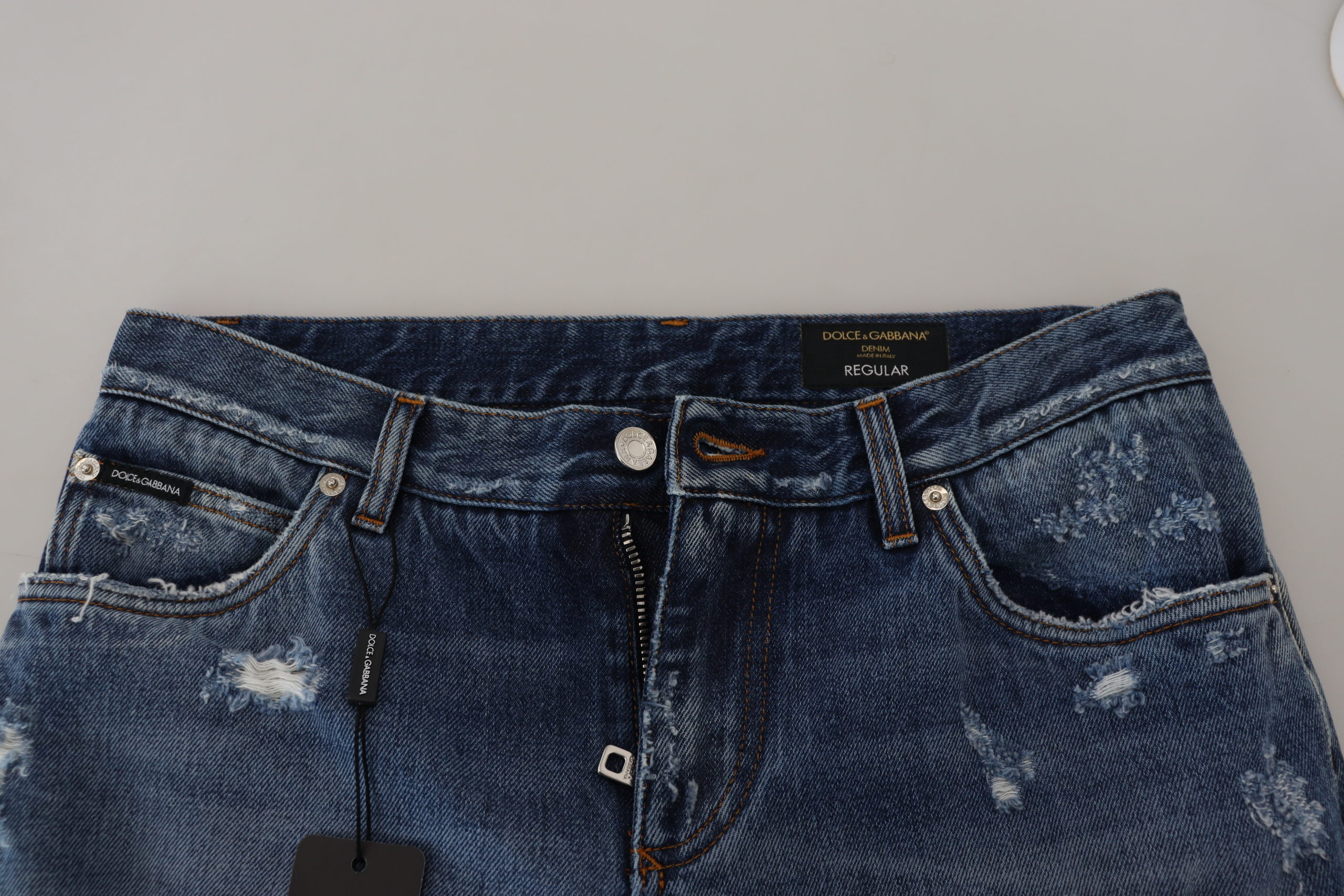 Explore the epitome of Italian craftsmanship with these chic tattered Denim Pants by Dolce & Gabbana. Perfectly blending luxury with casual style, these jeans are guaranteed to elevate your wardrobe. The contemporary blue washed design offers a versatile look, while the quality material ensures both comfort and durability. Embrace the effortless sophistication that comes with wearing a piece from a world-renowned fashion house. Make a bold statement in your everyday attire with these exquisite jeans.