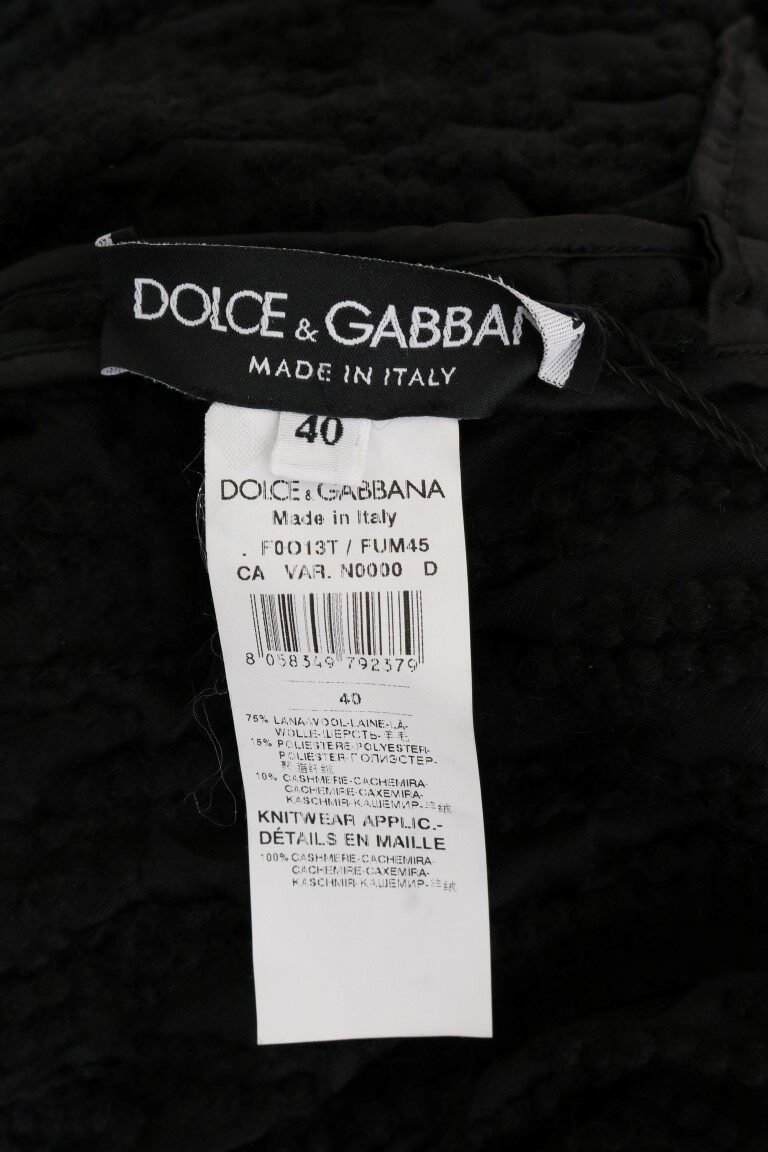 Indulge in the epitome of luxury with this sumptuous Dolce & Gabbana black fringed wool and cashmere coat sweater. Exuding sophistication, this turtleneck boasts Italian craftsmanship and the brand’s iconic logo details. Its blend of fine materials promises to envelop you in warmth and supreme comfort, making it a perfect addition to your high-end fashion collection.