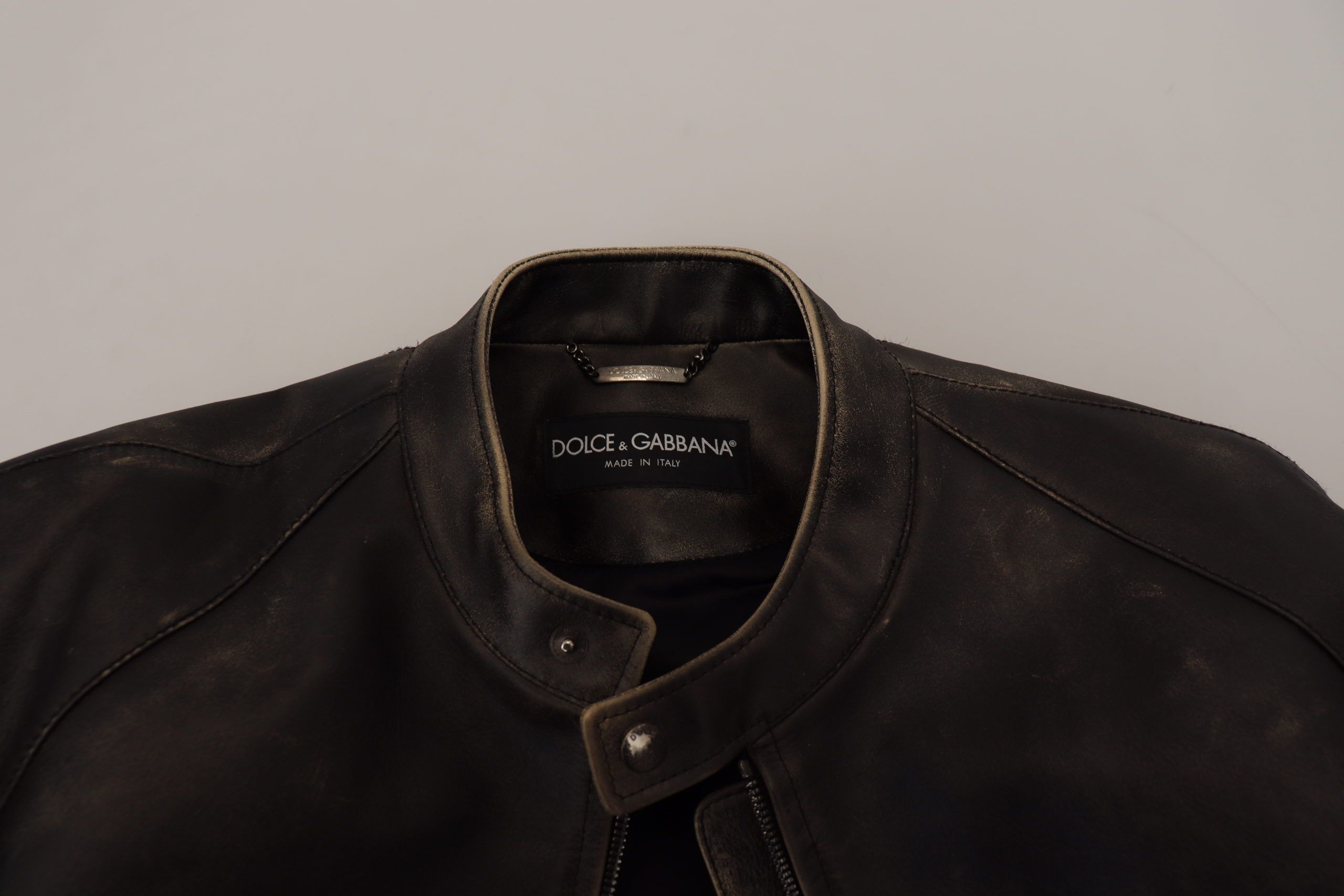 Indulge in the epitome of luxury with this stunning black leather jacket from Dolce & Gabbana. Renowned for their exquisite Italian craftsmanship, this 100% authentic jacket is a testament to high fashion and unparalleled style. The sleek black hue is accentuated by striking silver metal detailing, providing a distinguished look perfect for any sophisticated ensemble.