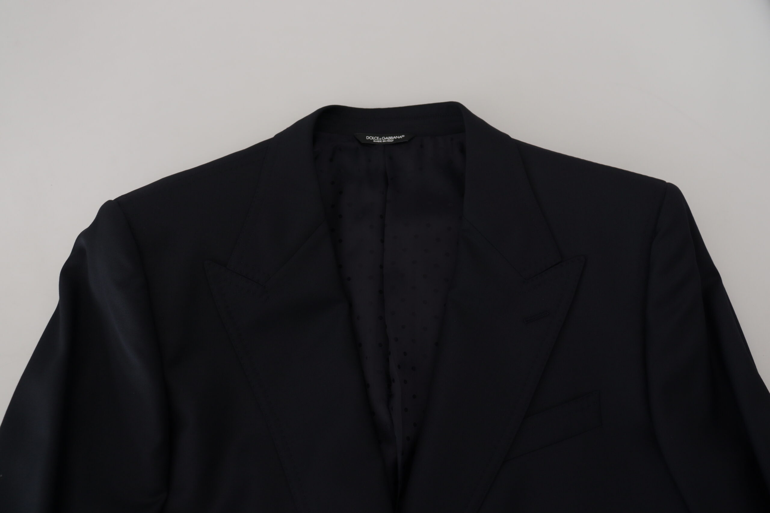 Exude sophistication with this 100% Authentic Dolce & Gabbana dark blue blazer. Tailored to perfection, this piece is ideal for formal occasions, to make a standout statement while maintaining a classic silhouette. Its fine wool construction promises luxurious comfort and unparalleled style. Proudly made in Italy, it features a smart single-breasted design, complete with sharp two button closure and practical front pockets, all finished with the subtle refinement of logo detailing.