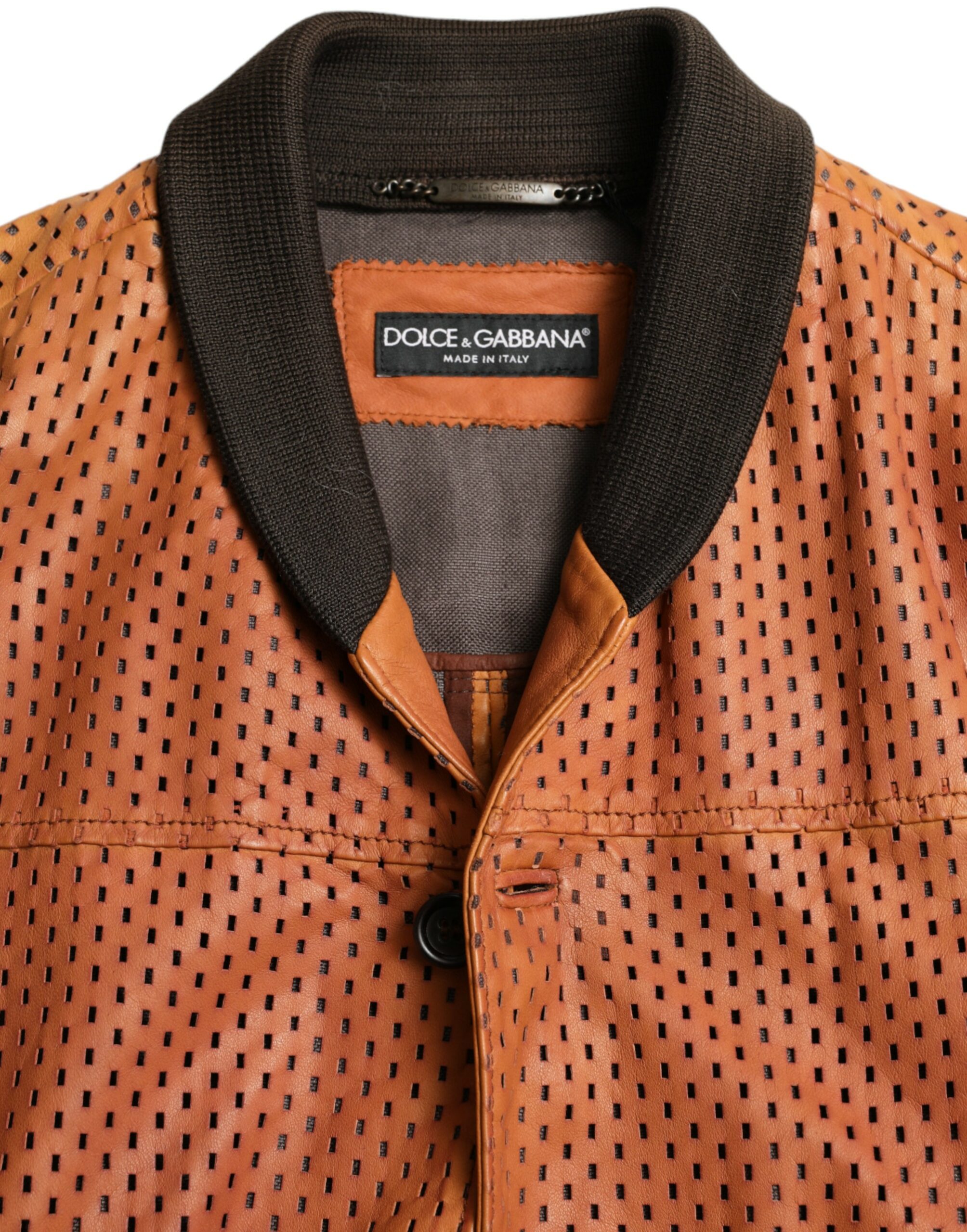 Step out in style with the sophisticated Dolce & Gabbana Leather Perforated Bomber Jacket. Perfect for discerning gentlemen who appreciate the finer things, this jacket elevates any look with its exquisite Italian craftsmanship and luxurious materials. A versatile brown hue complements its classic bomber silhouette, enhanced with a modern perforated design and sleek front button closure. Make a statement while enjoying the pinnacle of fashion luxury.