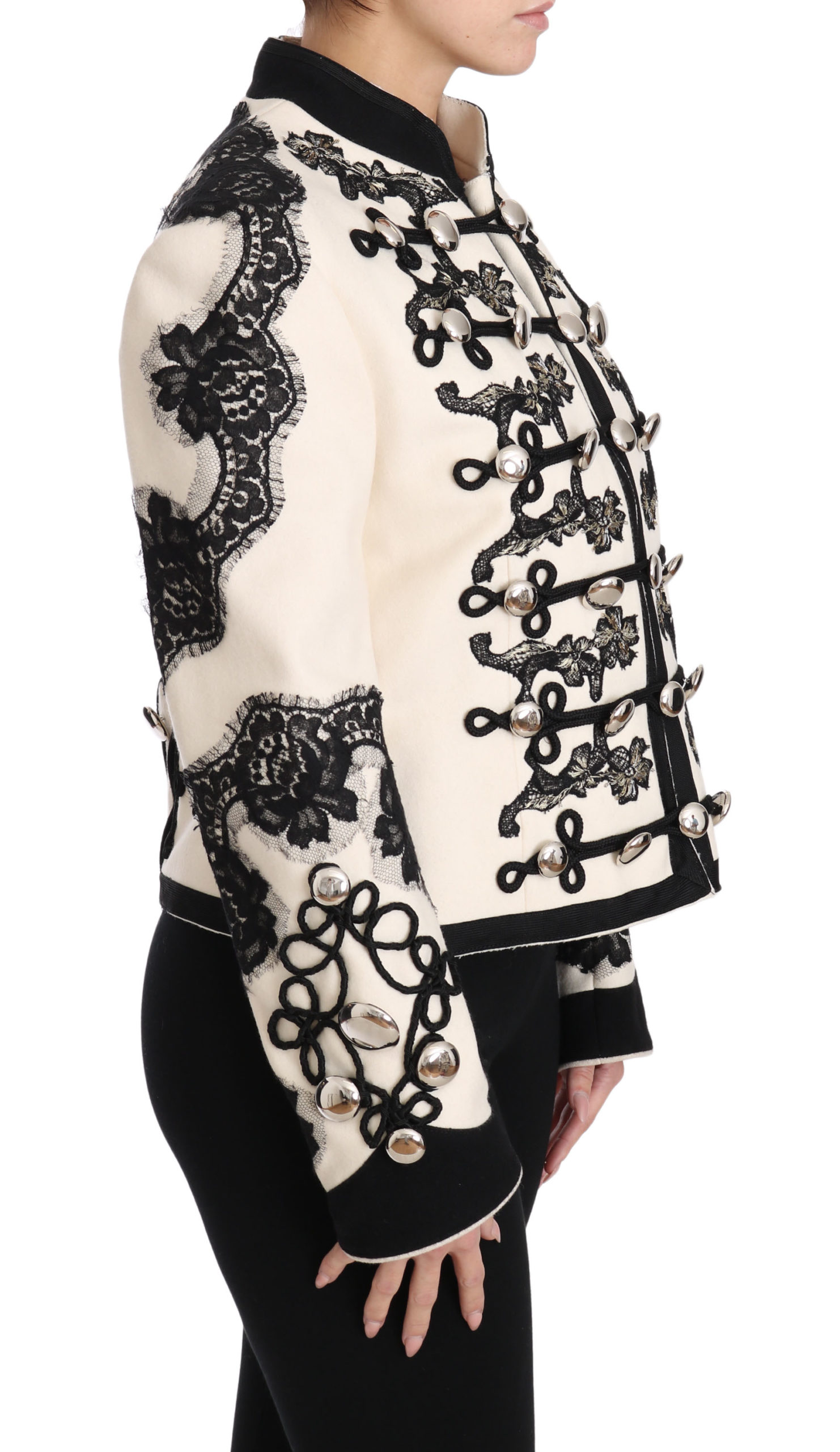 Embrace the epitome of luxury with this exquisite Dolce & Gabbana waist-long jacket, fresh off the runway and ready to elevate your wardrobe. This stunning piece features a sophisticated off-white and black color scheme, adorned with a lavish Sicilian-inspired floral baroque motif and shiny silver buttons for an opulent touch. Crafted with precision in Italy, it offers not only breathtaking aesthetics but also remarkable craftsmanship. A loop closure and a comfortable white inner lining ensure both style and ease of wear. Perfect for those seeking a statement garment that combines tradition with high fashion.