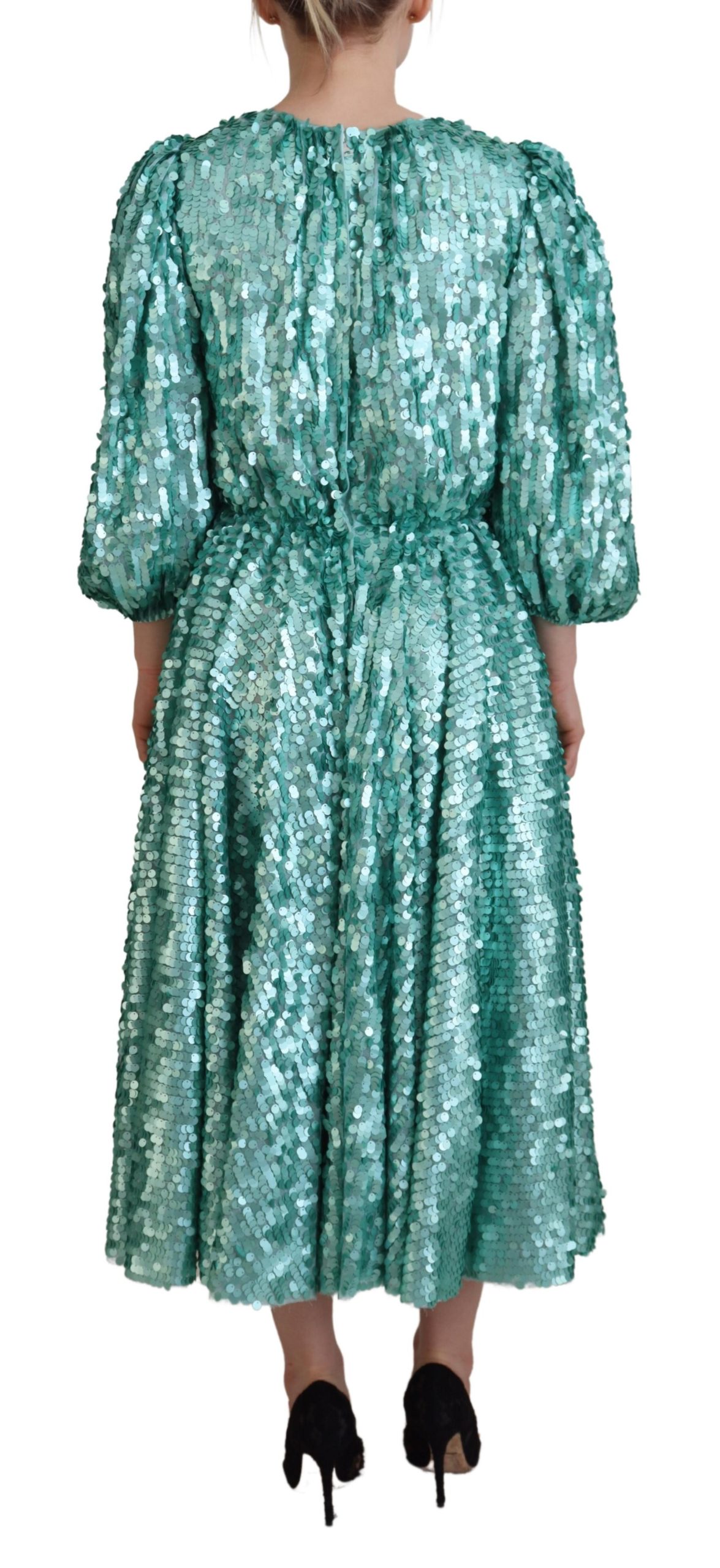 Step into the spotlight with this stunning Dolce & Gabbana sequined midi dress, perfect for any high-class event. Flaunt sophistication and style in this gorgeous A-line piece crafted from premium quality materials, adorned in a vibrant blue hue that’s sure to turn heads. Complete with a sleek zipper closure on the back and detailed with the exclusive brand’s logo for an added touch of luxury.