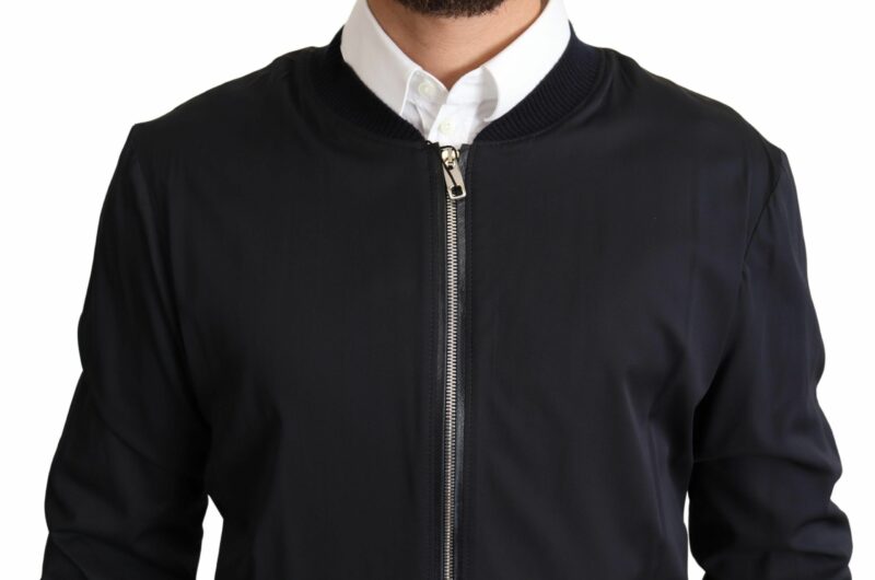 Indulge in the epitome of luxury with this exquisite Dolce & Gabbana bomber jacket. Crafted from a sumptuous blend of silk and sheep leather, this upscale jacket epitomizes refined style. Designed in Italy, it features a sleek dark blue color, a secure full zipper closure, and practical pockets with zipper closures. The jacket is adorned with subtle logo details that signify its premium quality and designer heritage.