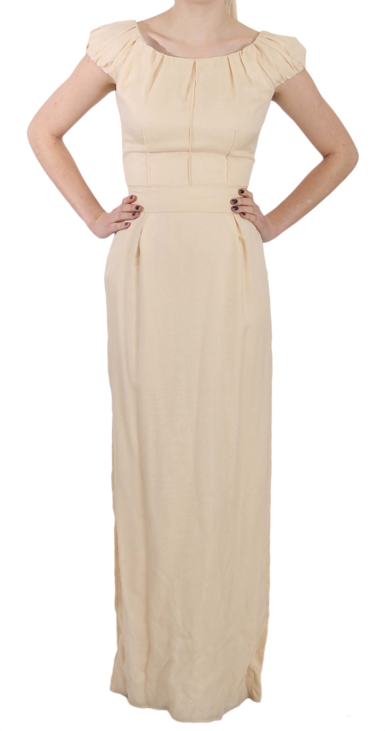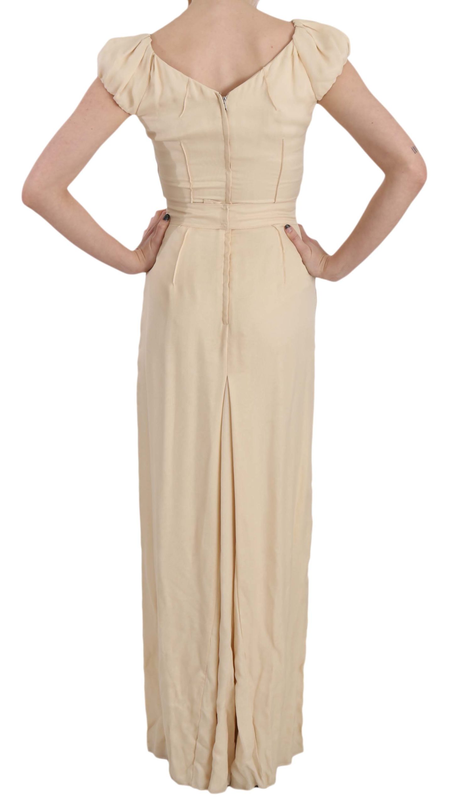 Embrace elegance with this stunning Silk Column Garterized Sleeve Gown by Dolce & Gabbana. This luxurious beige gown makes a statement with its sleek silhouette and intricate details. Its garterized sleeve offers a unique touch to the classic column style, while the back zipper ensures a seamless fit. Crafted in Italy, this dress exudes exclusivity and the epitome of high craftsmanship synonymous with Dolce & Gabbana. Ideal for exclusive events where making a sophisticated impression is key.