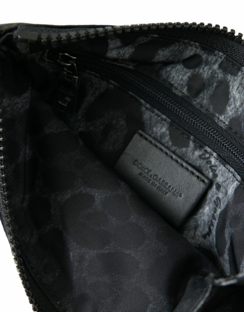 Indulge in the epitome of luxury with this Dolce & Gabbana pouch, a perfect blend of durability and elegance with its high-end nylon and grained calfskin composition. Designed for the discerning individual, the pouch boasts a bold new look, highlighted by a prominent Dolce & Gabbana metallic plaque. Its secure zipper top closure is adorned with a logo cursor, ensuring your essentials stay tucked away in style. The sleek black exterior is complemented by the iconic leopard print lining, a signature touch of the brand. Expertly crafted in Italy, this pouch is not just an accessory but a statement of exquisite craftsmanship.