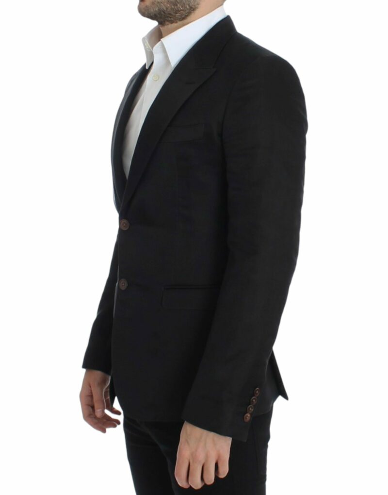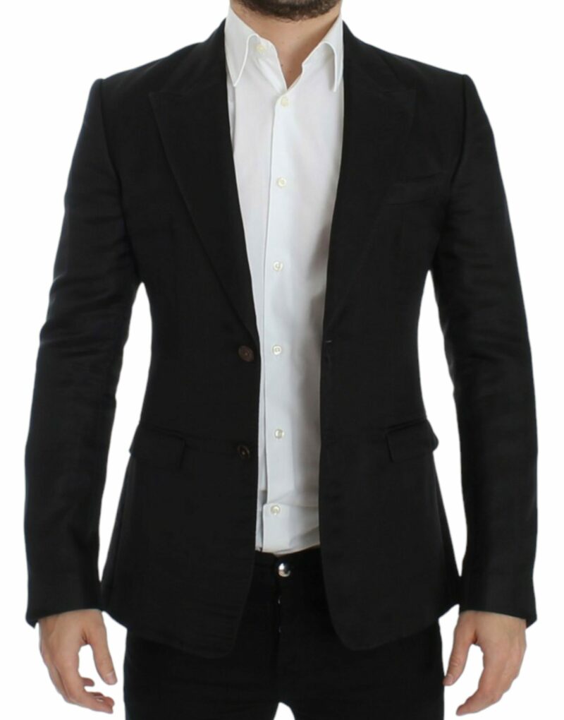 Discover the epitome of tailoring with this exquisite Dolce & Gabbana two-button slim fit blazer. Crafted for those who appreciate the finer things, this jacket is a testament to Italian fashion heritage and modern style. The high-quality silk and linen blend promises a luxurious feel and flawless appearance, ideal for any formal or high-class event. Whether at a gala or a sophisticated gathering, this blazer ensures you will stand out with its sleek black color and impeccable logo details. Experience comfort coupled with elegance, all while exuding the confidence of a truly dapper gentleman.
