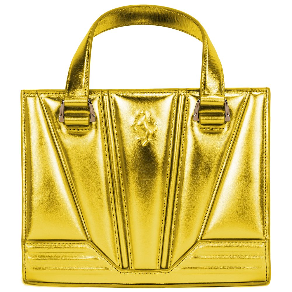 Ferrari,hand bag, 100% leather, metllized yellow color, magnetic closure with inside card pockets and iconic logo on the front.