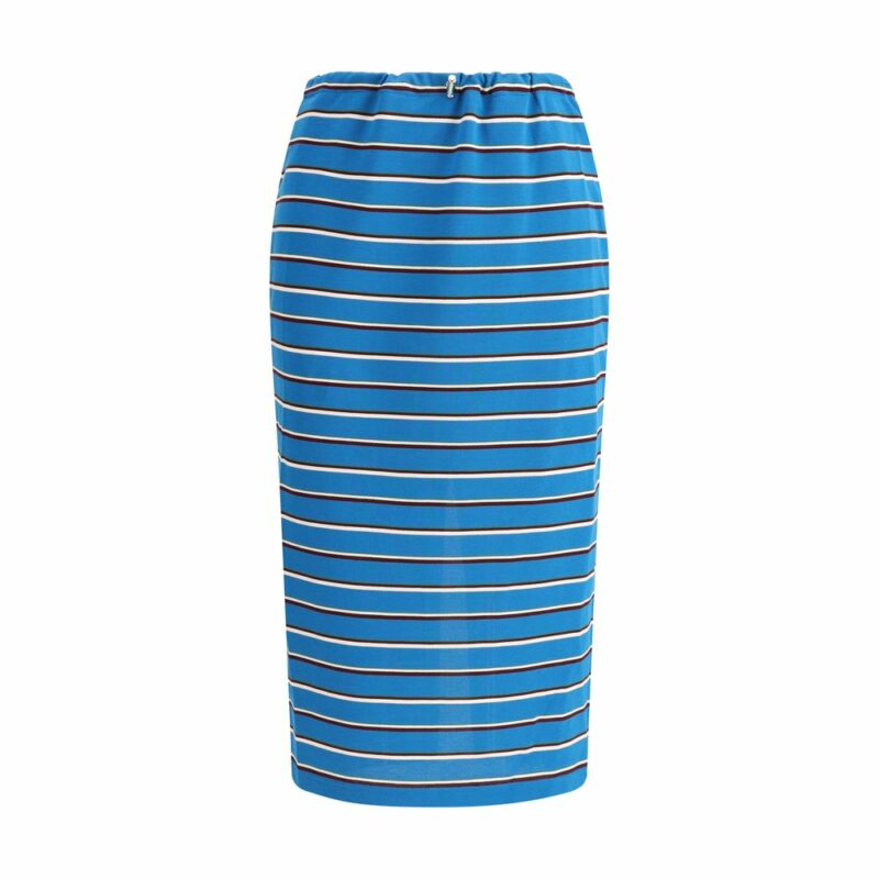 Prada’s striped midi Skirt is a versatile and contemporary piece with a stretch design that ensures comfort and a perfect fit. The adjustable elastic waistband with drawstring allows you to customize the fit, while the triangular patch on the back adds a distinctive and recognizable brand touch. The back slit lends a bold detail that combines elegance and dynamism. Ideal for a casual-chic look or for occasions when you’re looking for a mix of style and practicality.