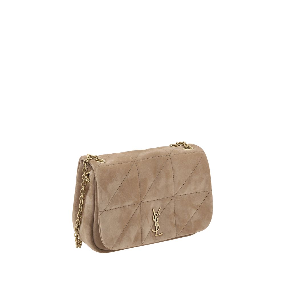 The Jamie Shoulder Bag by Saint Laurent is made of suede and features a sleek and sophisticated design. It has a flat top handle and a chain shoulder strap with a leather insert for added comfort. The flap closure on the front is embellished with the iconic YSL detail, a distinctive symbol of the brand. The quilted design lends a touch of sophistication, while the interior is organized with a single compartment.